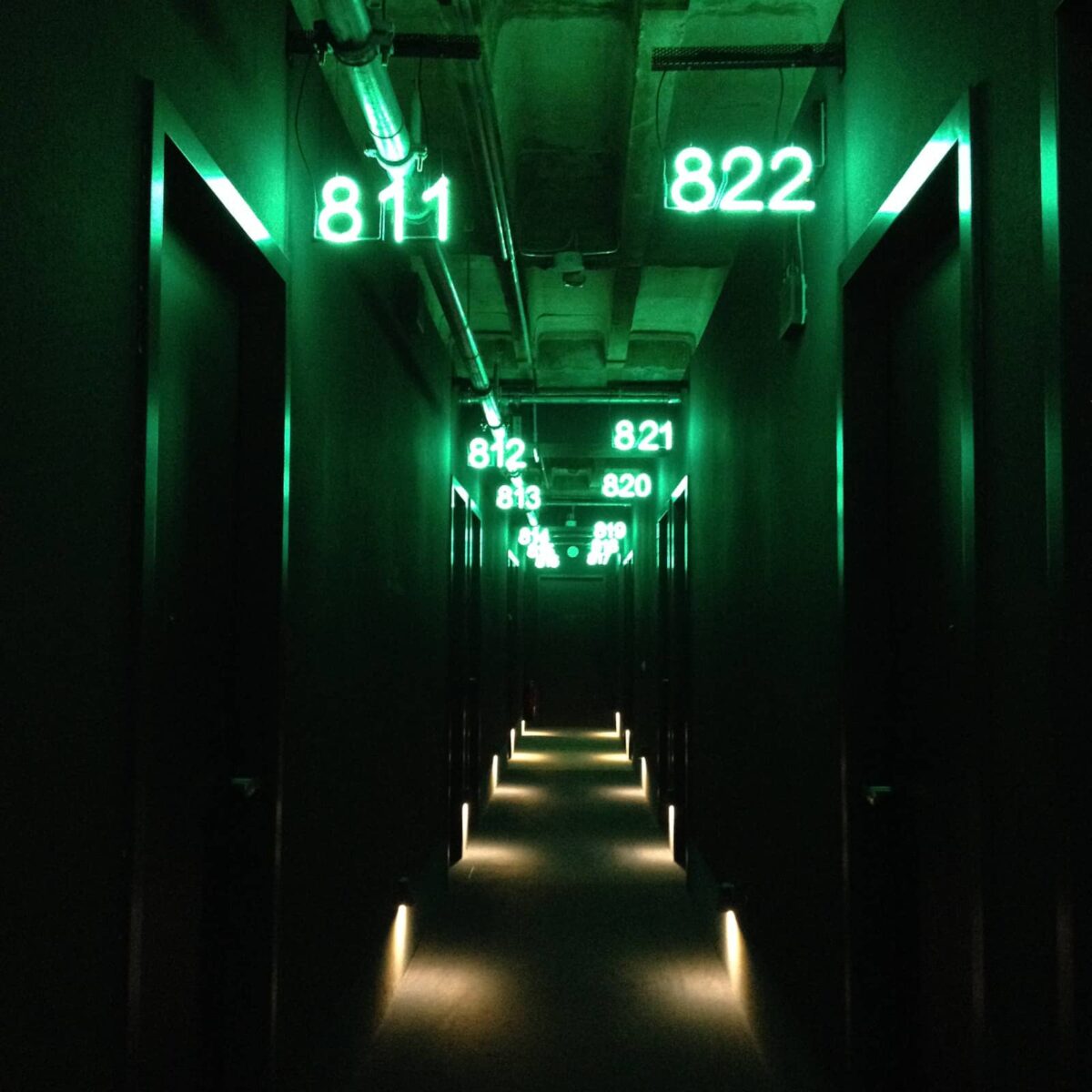Le couloir est plongé dans une semi-obscurité. Des néons qui indiquent le numéro de chaque chambre émane une lumière verte. Béton brut, souffle léger de la clim. L’atmosphère est au mystère. J’avance à pas feutrés jusqu’à la porte de ma chambre. Suspendu à la poignée, un message :